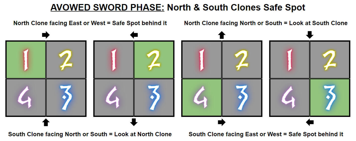 - 4 Guards appear & 2 by 2 will walk a number of squares indicated above their heads, then use a rectangular-shaped AoE across the playable arena