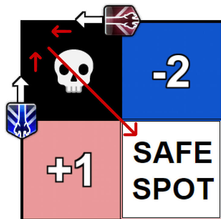 - 4 guards appear & 2 by 2 of them will walk a number of squares indicated above their heads, then use a plus-shaped AoE. This is done in two steps, as guards will move 2 by 2: